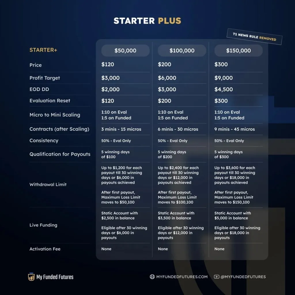 The MFFU Starter Plus account is the newest addition to the funded plans available. It is designed for aspiring traders looking to enter the funded trading world with minimal risk. This account offers additional features to the original starter plan as well as a low-cost entry point while providing access to real capital for futures trading.