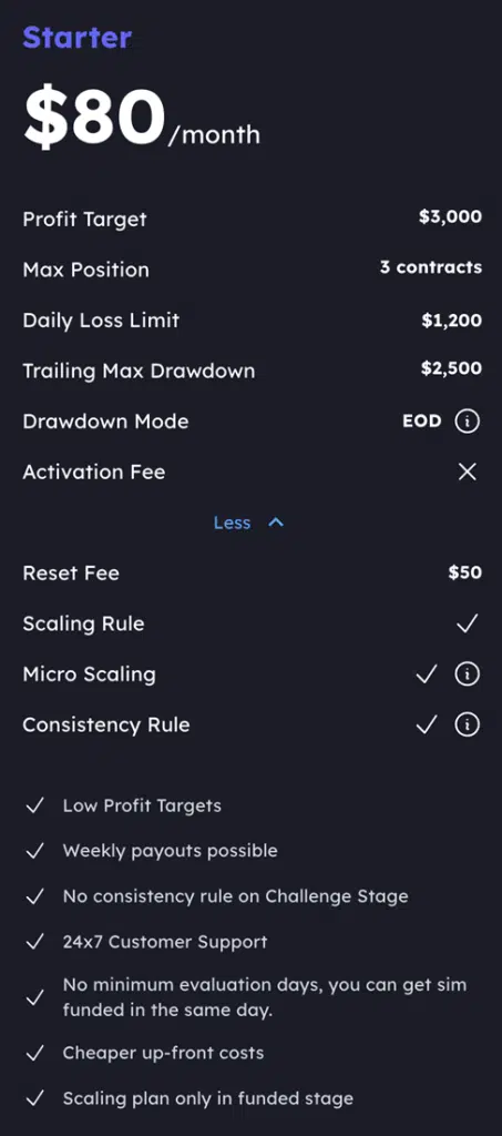 MFFU offers competitive pricing for its Starter+ accounts, giving traders various funding options based on their desired account size: