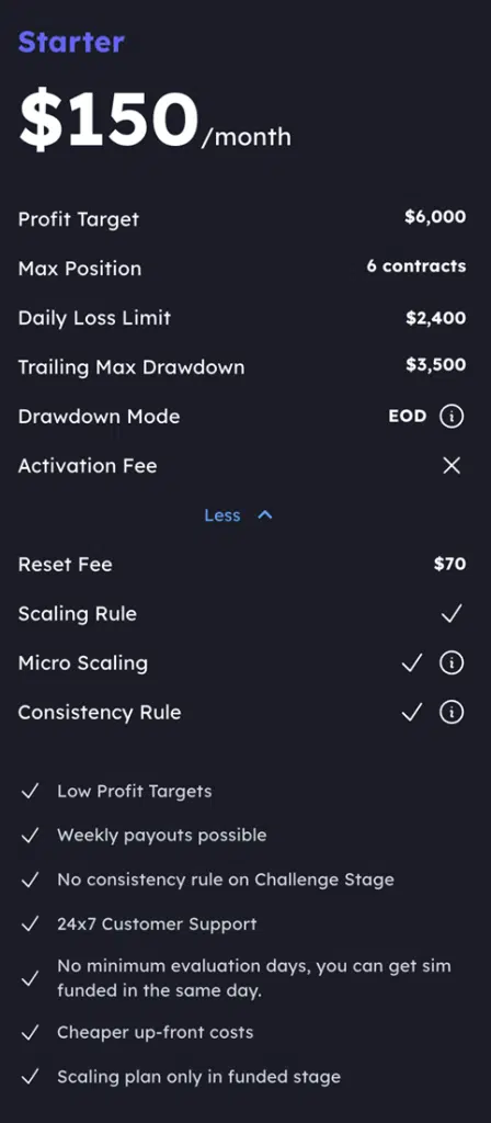 | Account Size | 50K Starter Plan | 100K Starter Plan | 150k Starter Plan |