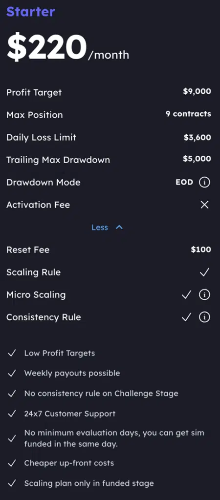 No Daily Loss Limit (DLL) on Evaluation or Funded Accounts: The Starter+ account removes the daily loss limit, giving traders the flexibility to manage their trades without being penalized for daily drawdowns.