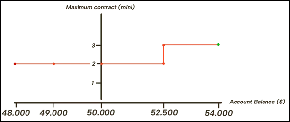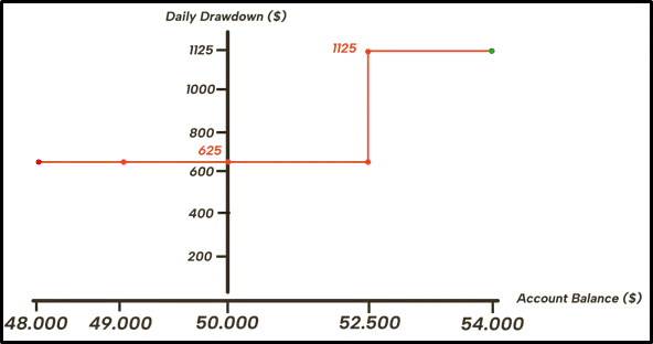 Daily drawdown is the other essential component of the intra-challenge scaling plan. As with the maximum position size, the daily drawdown of the 50k account is modified only once, when the account balance rises to $52,500.