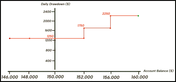 For the 150K account, the principle is the same, and 2 adjustments are made. The basic daily drawdown of the challenge is set at $1250, once you’ve generated $2000 in profit this increases to $1750 and once you’ve generated over $6000 in profit this increases to $2250 for the remainder of the challenge.