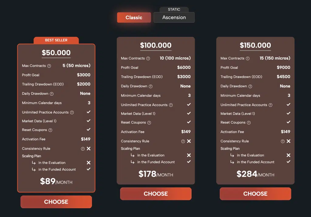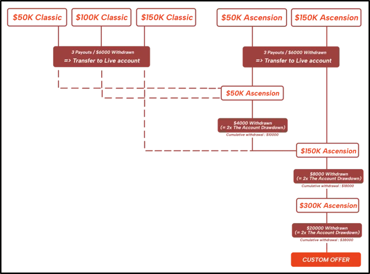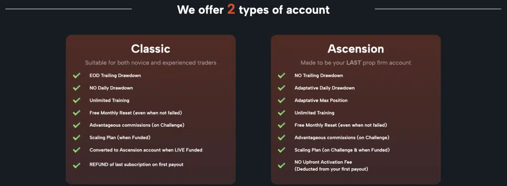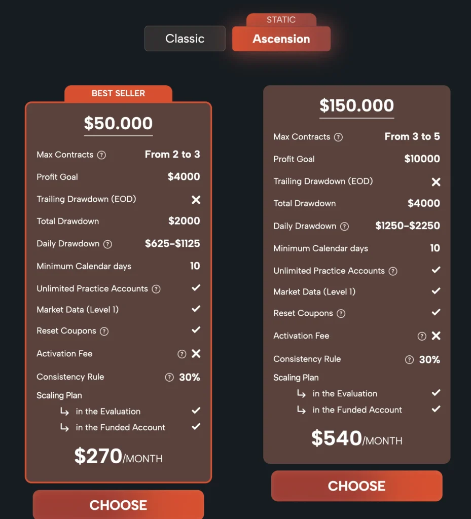 The Ascension Challenge offers an alternative to the “Classic Challenge” with a focus on daily drawdown limits and avoiding excessive position sizing. It can be appealing to traders who dislike trailing drawdowns but require discipline in daily risk management.