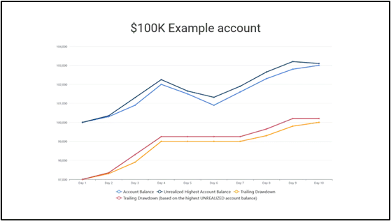 In short, while the Unrealized PnL method adjusts the drawdown continuously based on current profits and losses, the End-of-Day method recalibrates the drawdown only once a day, offering the trader a more stable approach and greater freedom.