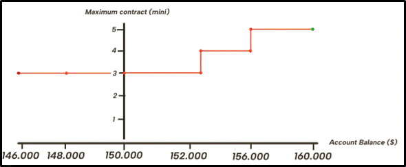 The 150K account is the direct continuation of the 50K account, but this time 2 changes are depending on the profits you generate. When the challenge begins, you have access to 3 mini contracts (30 micros), once you’ve made $2,000 in profit, the position rises to 4 mini contracts (40 micros), and finally, when you’ve made $6,000 in profit, the maximum position is raised to 5 contracts.