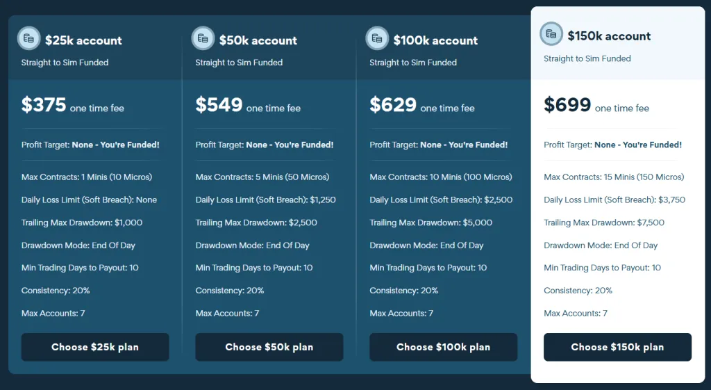 | $150k Sim Funded | $699 | X | X | $7,500 | Maximum of 15 contracts | 20% consistency rule applies |