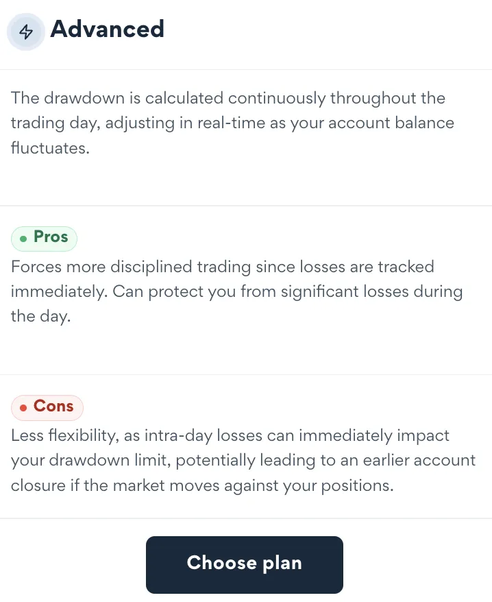 The Advanced Plan features a dynamic drawdown calculation that adjusts in real-time based on your account’s performance throughout the trading day.