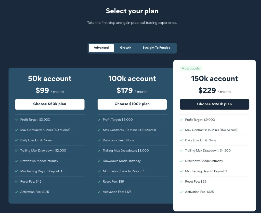 Through the “Advanced” and “Growth” challenges, traders begin with a simulated account to meet specific profit targets while adhering to strict risk management rules. Successful completion of these challenges grants traders access to a simulated funded environment to further confirm their consistency. For those who prefer a more direct path, Tradeify also offers the “Straight to Funded” challenges, providing immediate access to a simulated funded environment to showcase their trading abilities.