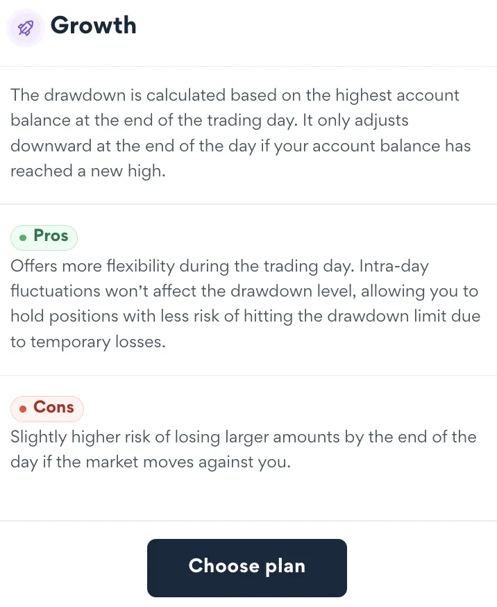 The EOD Trailing Drawdown is a risk management tool used in the Growth Plan. It’s designed for traders who prefer to hold trades to their full target or stop-loss without being impacted by intraday price fluctuations.